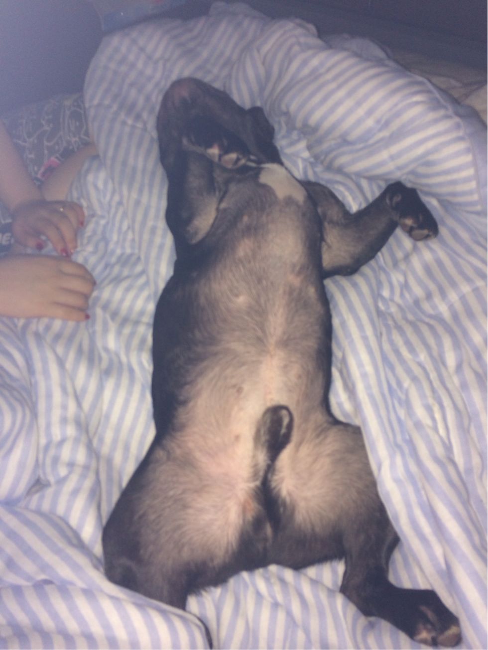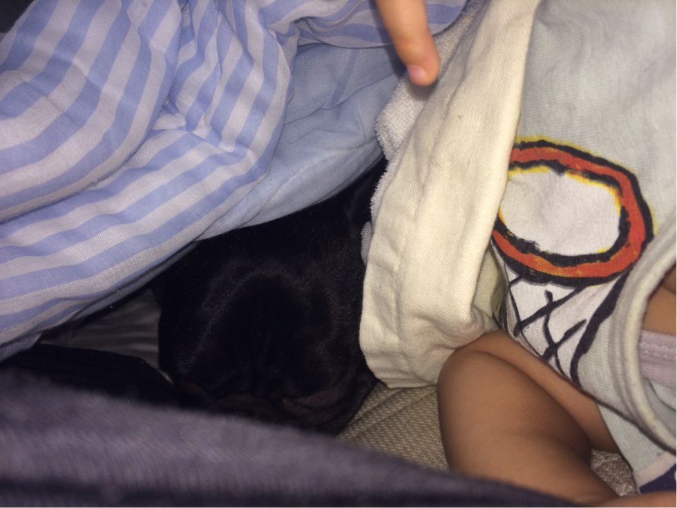 〈実家寒くてチビと私の間にもぐりこんで寝る豆さん〉